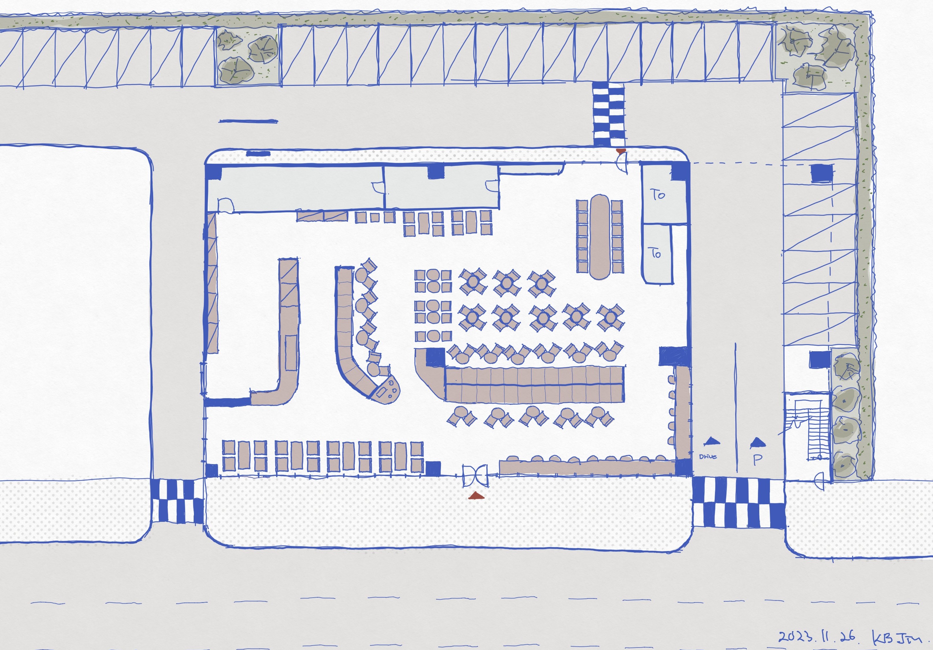 커피숍에 앉아 2시간 가량 생각을 하며 곰곰히 그림을 그리면서 커피숍을 설계 할 때 고려 사항에 대해서 고민을 했다.